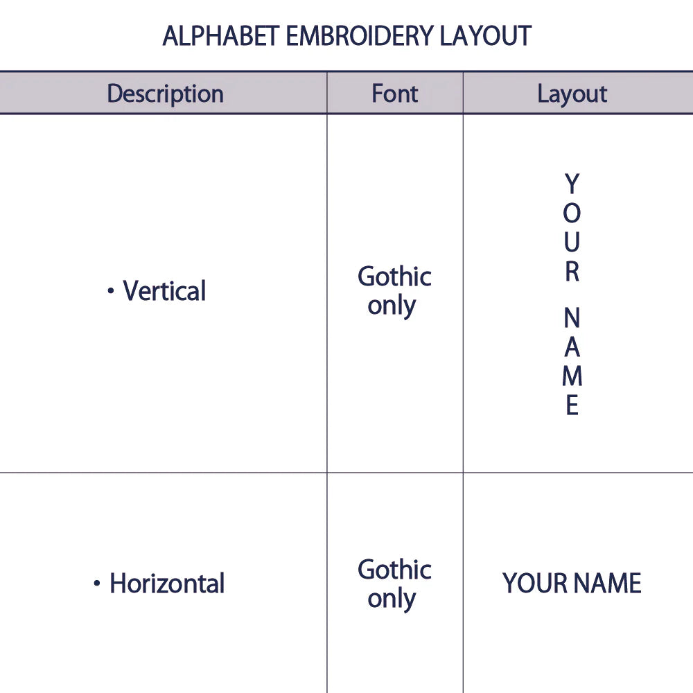*The sizing of the embroidery may have a minor difference depending on the character.