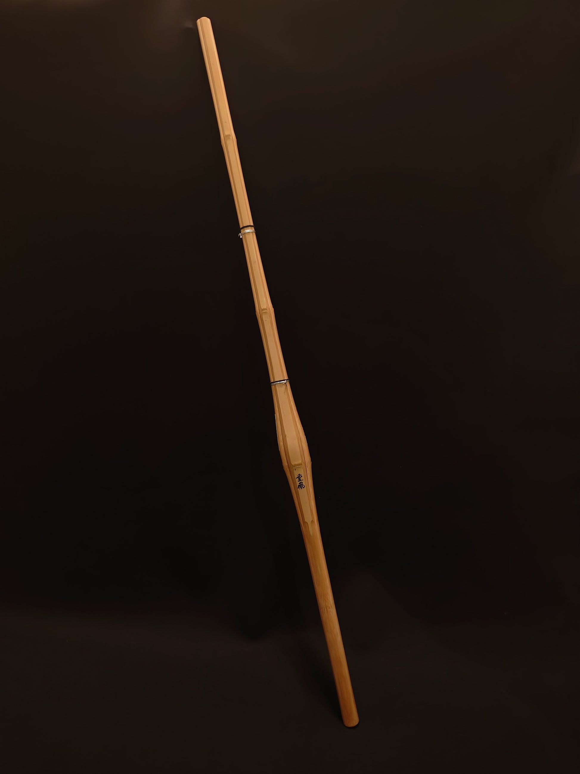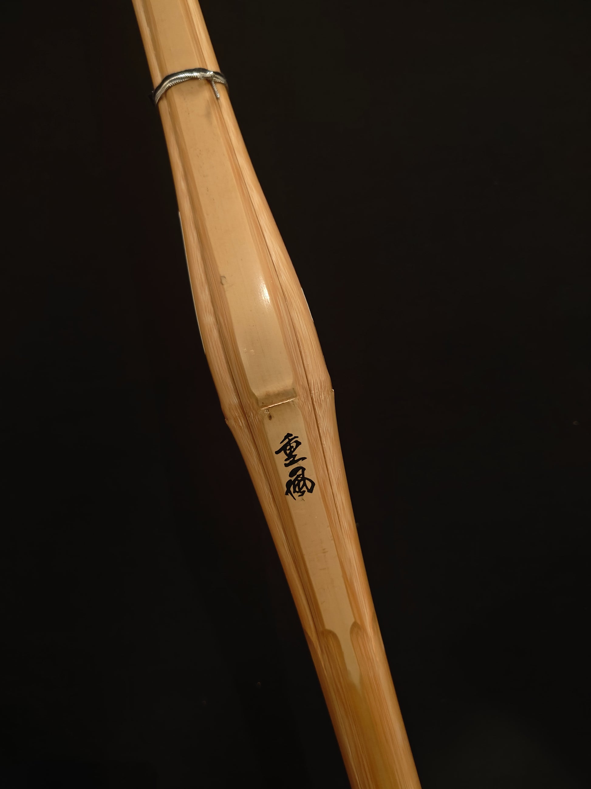 This shinai is Jissen-gata/Dobari, with the knot right above the right hand, "dobari", is made fat with a narrow tip.